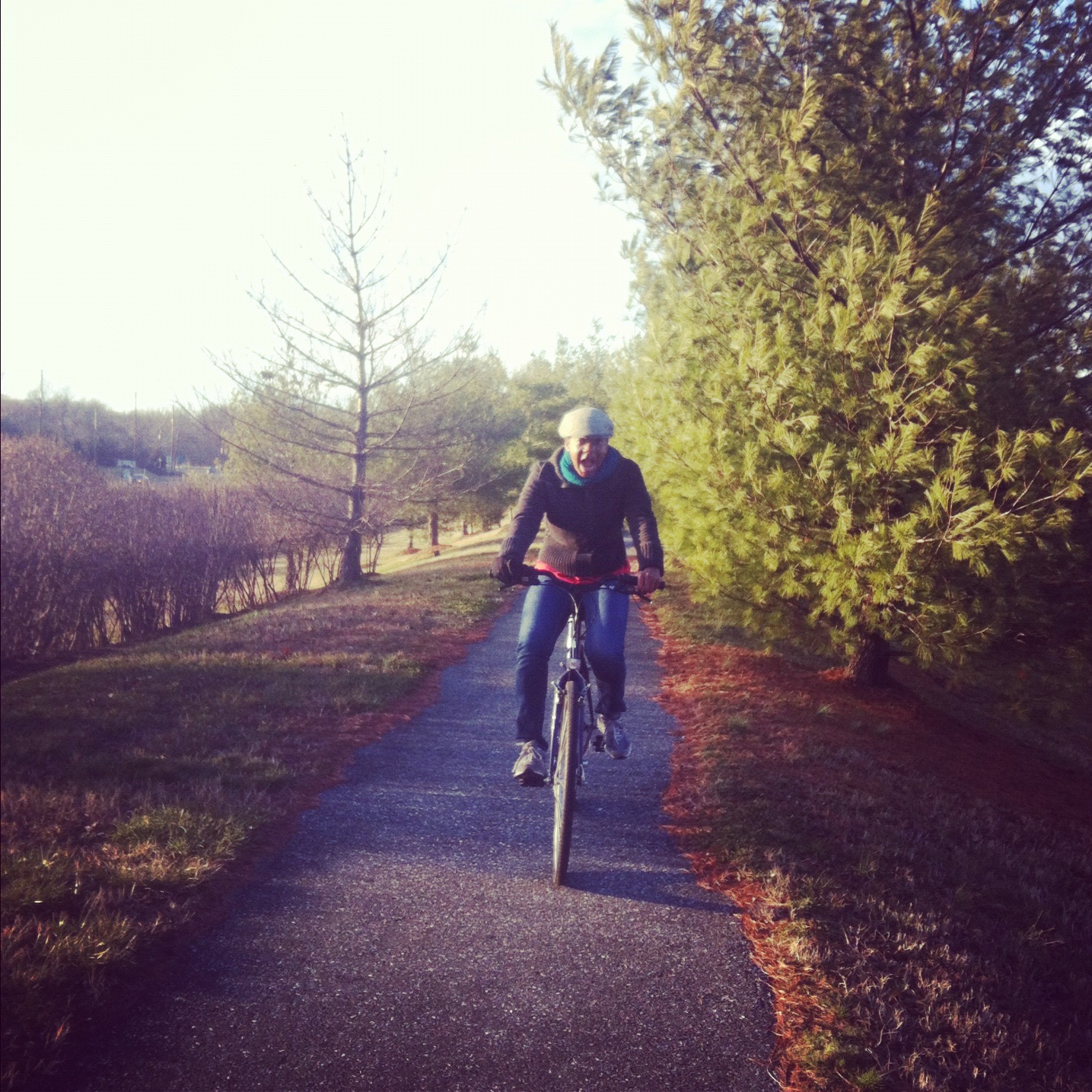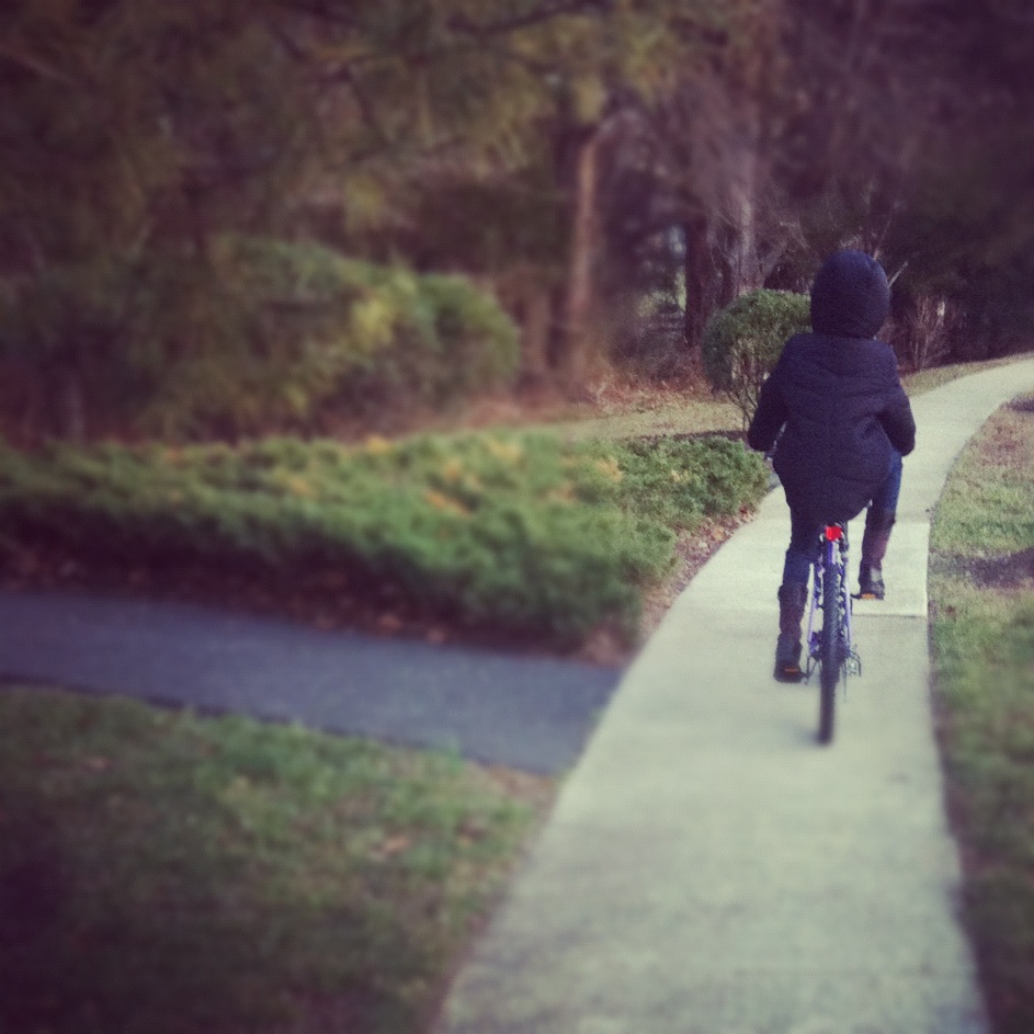 Saturday comes and she’s at my house excited and ready to go.. Apparently the sun gods were off work that day and their weather husbands were on vacation IT WAS FREEZING. I was really trying to fathom in my head why she would want to ride her bike in the sunless cold but couldn’t come up with a solution. Now, let me preface by saying, telling her “no, lets wait until spring” was not an option. I have realized the role I play in her life and I also remember being that young and 1. being excited to be with someone I look up to, 2. receiving something new and wanting to try it, use it, and do it all day. Nevertheless I digress.. I grab a hat, scarf, 2 sweaters, coat and gloves and head outside as she eagerly awaits.. We take off down the path and shes beaming with joy.. Was I beaming with joy?? Well, thanks to the wind, my eyes looked like I cut 1,000 onions and the only thing that prevented my lips from freezing off was the ninja like tying skills I did with my scarf.
